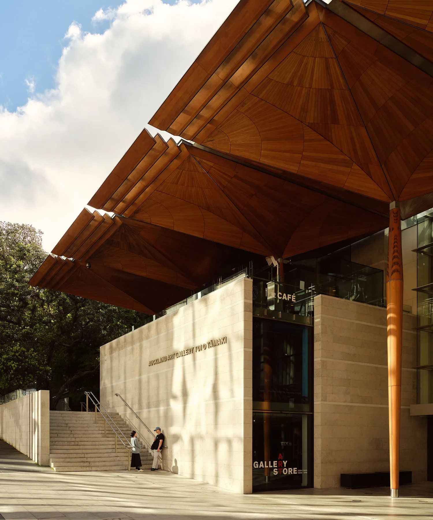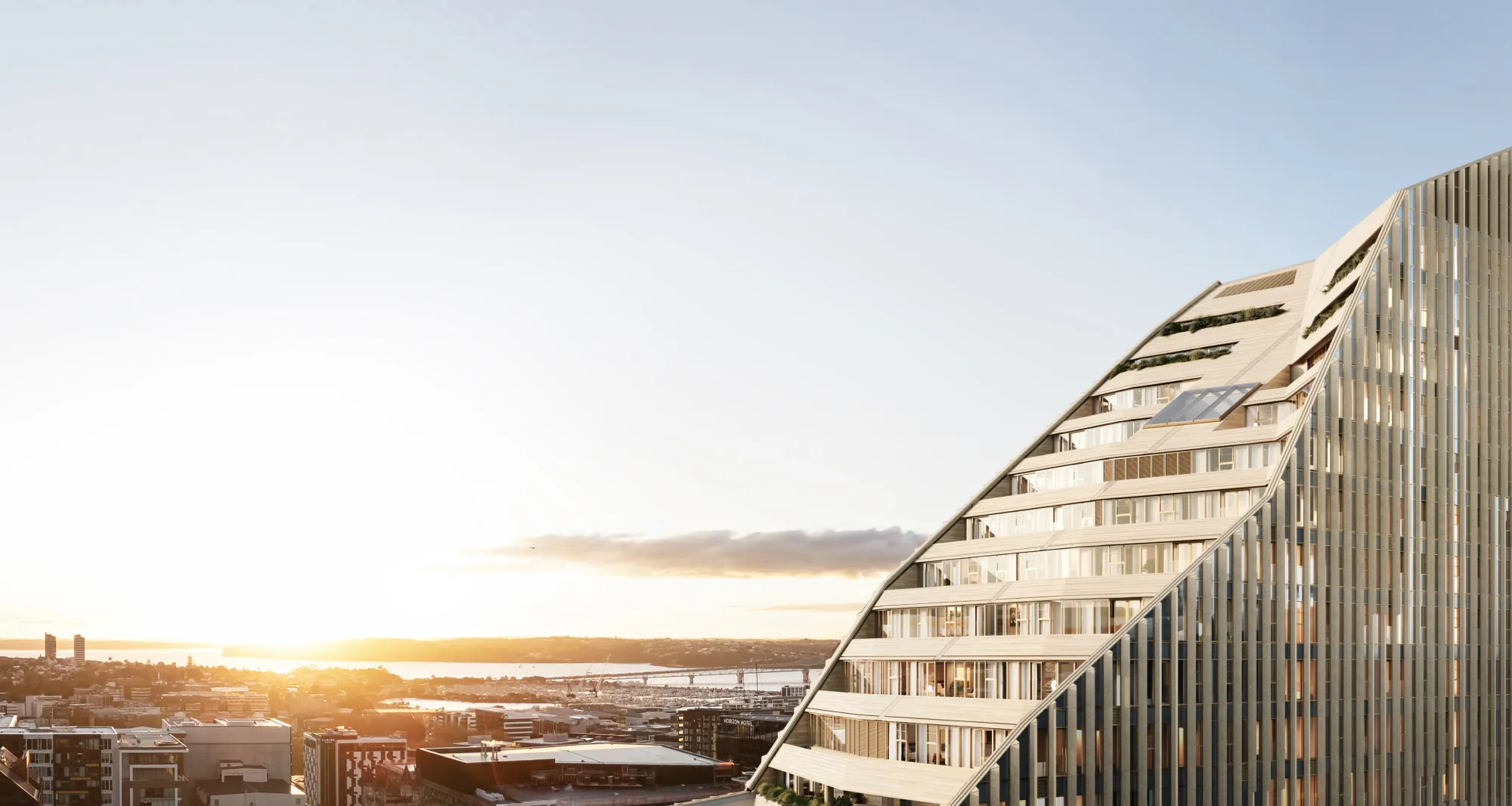 With its striking irregular façade and sweeping roofline, designed to cast no shadows over Aotea Square, the Symphony Centre will be a defining landmark of the Auckland skyline. The building features uniquely crafted living spaces with views of Mount Eden and the Waitakere Ranges, and its glass-reinforced concrete façade, inspired by local Waitematā sandstone, showcases a poutama pattern by artist Graham Tipene, creating dynamic celestial effects throughout the day.